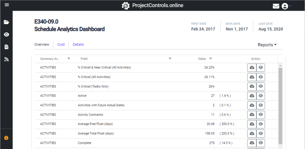 Analytics are revamped, featuring a consolidated dashboard for data, cashflow, cost, and detailed information. Download details, images, and reports in Excel or XML format. Additional schedule file support types are coming soon.